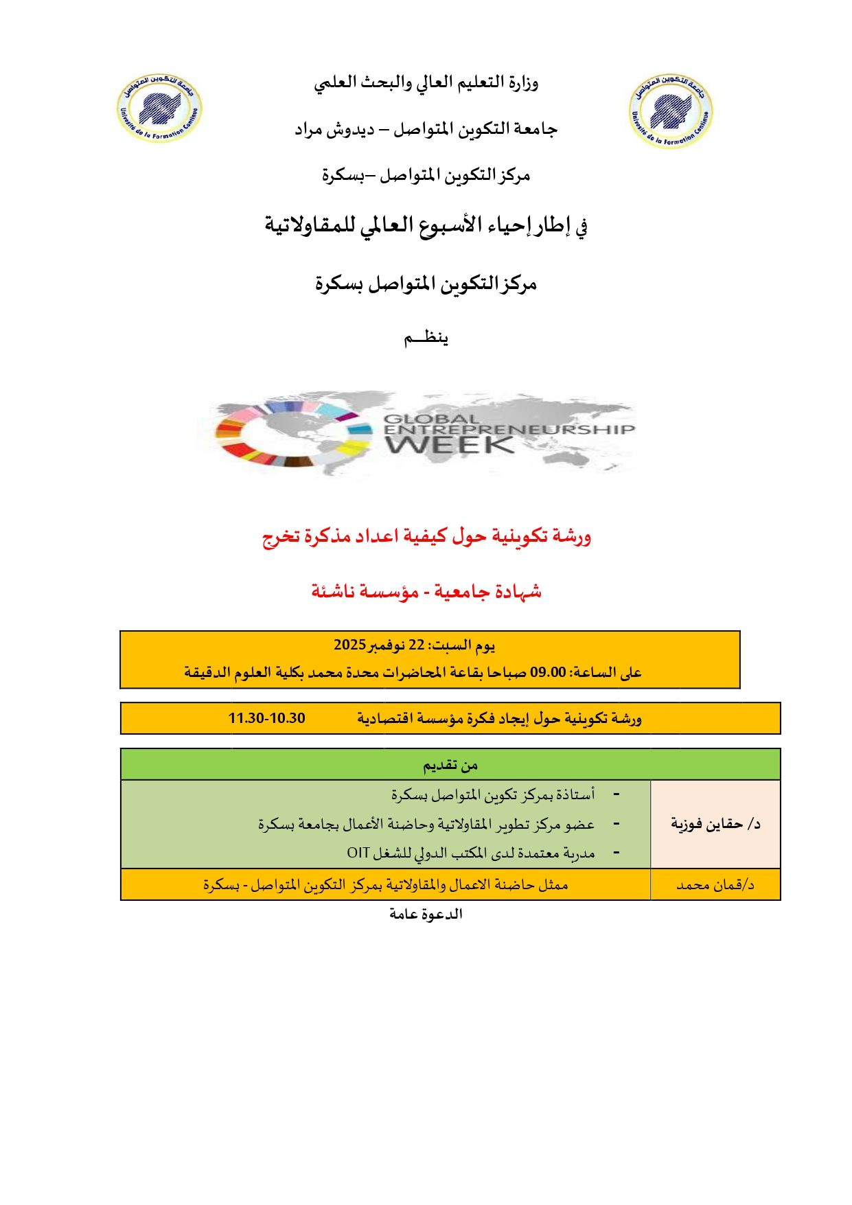 #اعلان عن ورشة تكوينية حول كيفية اعداد مذكرة تخرج مؤسسة ناشئة #يوم السبت 22نوفمبر 2025 ابتداء من الساعة 10.30 بقاعة المحاضرات بكلية العلوم الدقيقة