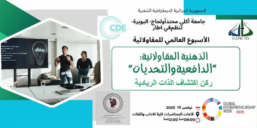 ندوة تفاعلية بين مركز تطوير المقاولاتية، كلية العلوم الاجتماعية والإنسانية ومركز المساعدة النفسية، تقوه على اختبارات شخصية سريعة  Coching لاكتشاف الذات الريادية لدى الطلبة والشباب