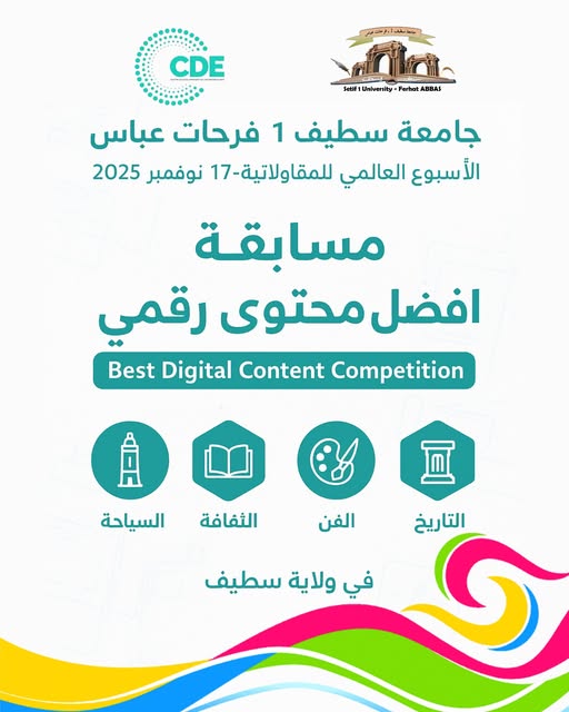 في إطار أنشطة الأسبوع العالمي للمقاولاتية، تنظم الواجهات، مركز تطوير المقاولاتية ،الحاضنة، مركز دعم التكنولوجيا والابتكار مسابقة أفضل محتوى رقمي موجهة لكل طلبة جامعة سطيف 1