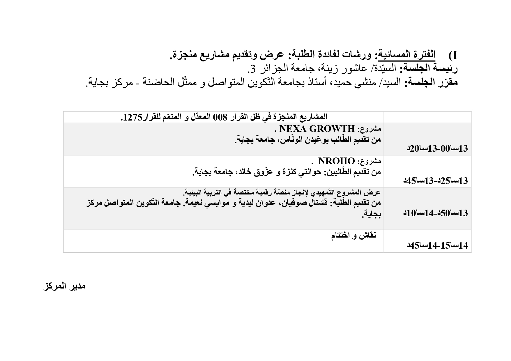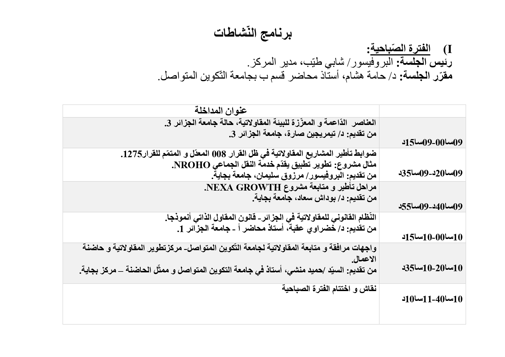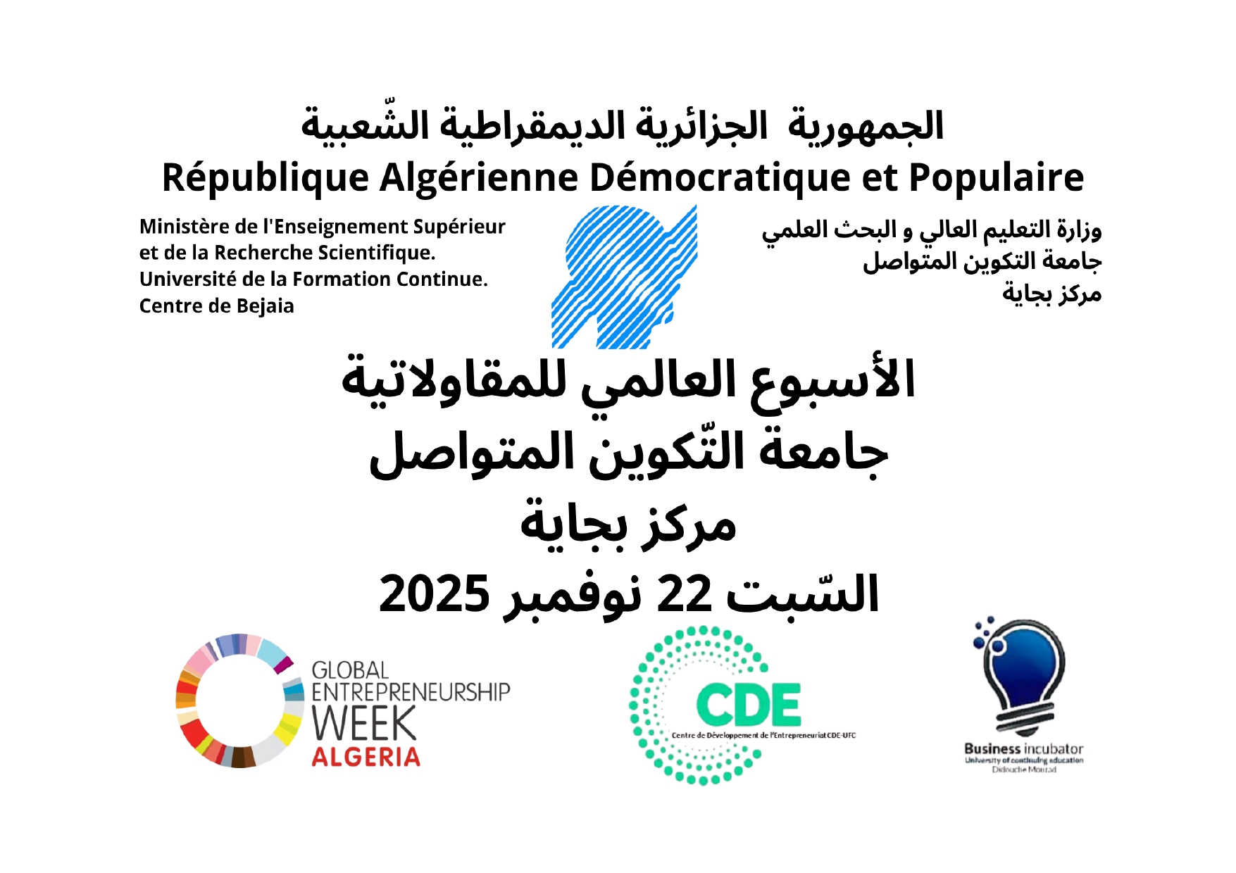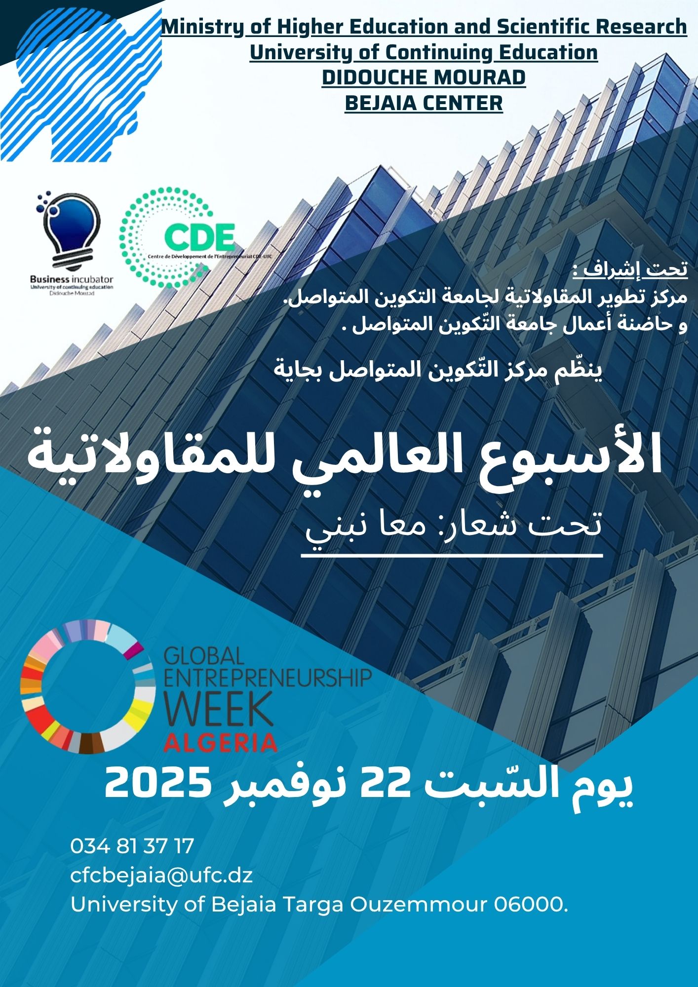 في إطار فعاليات الأسبوع العالمي للمقاولاتية، و تحت إشراف مركز تطوير المقاولاتية و حاضنة الأعمال لجامعة التكوين المتواصل ديدوش مراديقدّم مركز بجاية يوم السّبت 22 نوفمبر  2025 ابتداء من السّاعة التّاسعة صباحا برنامجا ثريا يتضمّن محاضرات و ورشات يؤطّرها أساتذة المركز و متخصصين في المقاولاتية و ريادة الأعمال، و ستكون فرصة ثمينة للطّلبة للتعرّف على القرار 008 المعدل و المتمم للقرار 1274 و الذي يحدّد كيفيات إعداد مشروع مذكّرة تخرج للحصول على شهادة جامعية -  مشروع مؤسّسة اقتصادية من قبل طلبة مؤسسات التعليم العالي.  حضوركم يشرّفنا و الدّعوة عامة