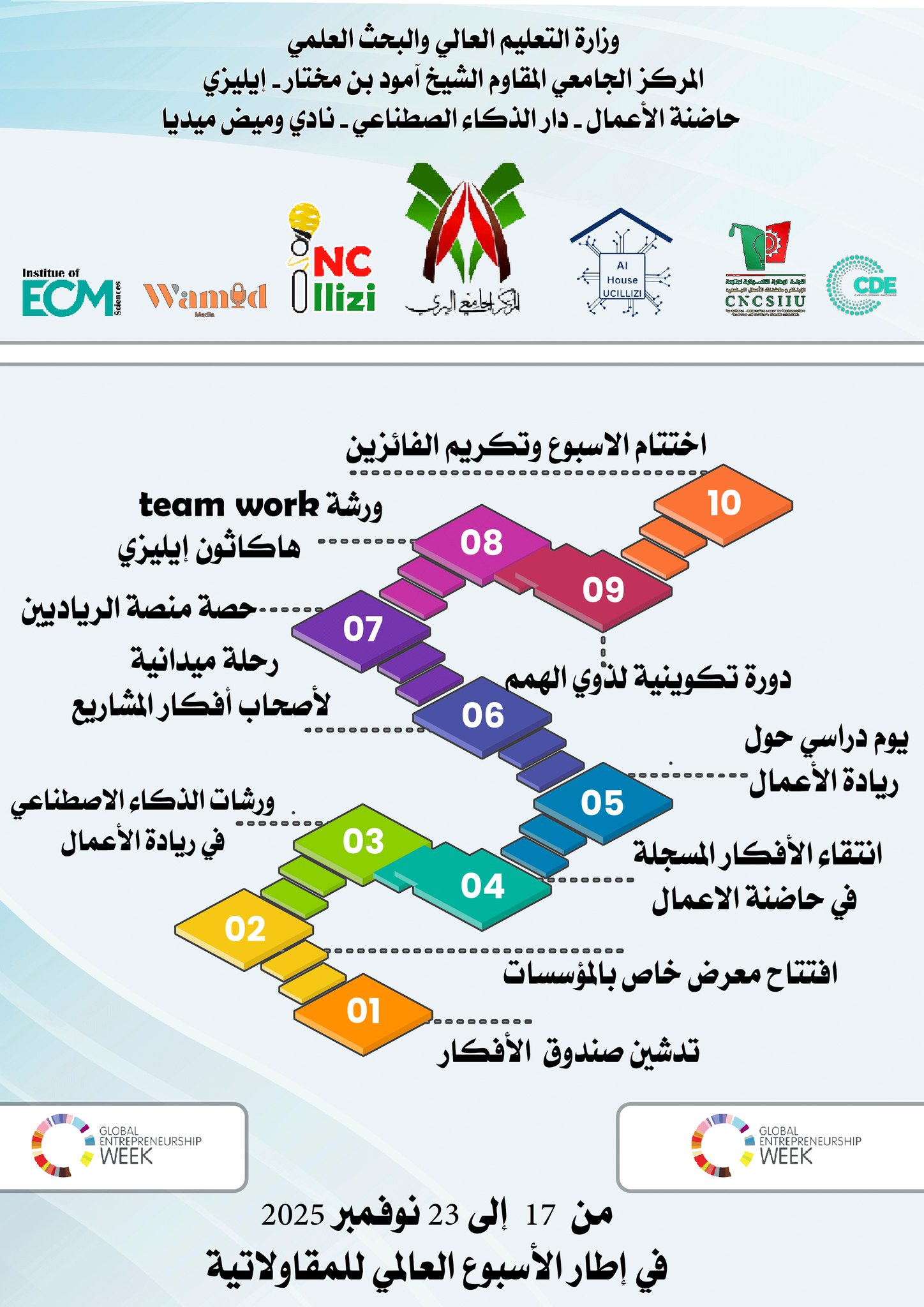 As part of its ongoing mission to strengthen innovation and entrepreneurial mindset among youth, the Illizi University Center, in collaboration with the Artificial Intelligence House, is launching a dynamic series of activities in celebration of Global Entrepreneurship Week.