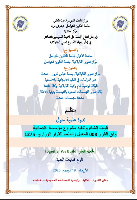 "خنشلة في اطار احياء الاسبوع العالمي للمقاولاتية يسر جامعة التكوين المتواصل- ديدوش مراد مركز خنشلة دعوة كل مكونات الاسرة الجامعية طلبة ، اساتذة ، موظفين لحضور فعاليات الندوة العلمية الوطنية الاولى حول موضوع المقاولاتية عنوان الندوة العلمية آ
