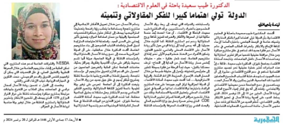 مقال صحفي للفاضلة الدكتورة طيب سعيدة أستاذة باحثة في العلوم الاقتصادية. أستاذة مكونة بمركز تطوير المقاولاتية لجامعة غليزان