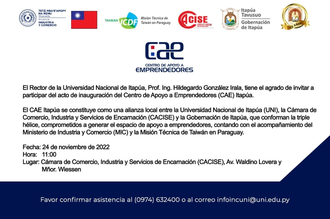 Inauguración del Centro de Apoyo a Emprendedores (CAE-Itapúa) , a realizarse en la Cámara de Comercio, Industria y Servicios de Encarnación (CACISE), por el sector privado; y la Gobernación de Itapúa, por el sector público; que junto a la UNI, la academia; conformando la triple hélice, como modelo de desarrollo económico