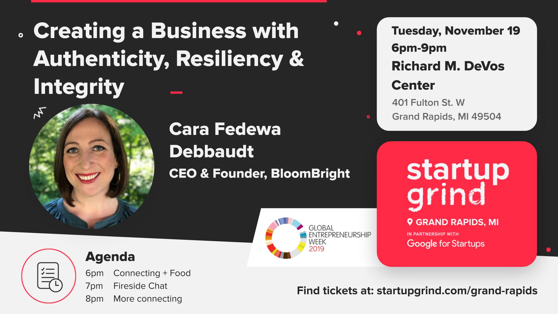Startup Grind Grand Rapids is proud to host Cara Fedewa Debbaudt, Founder & CEO of BloomBright, as the speaker for our inaugural event on Tuesday, November 19, 2019.