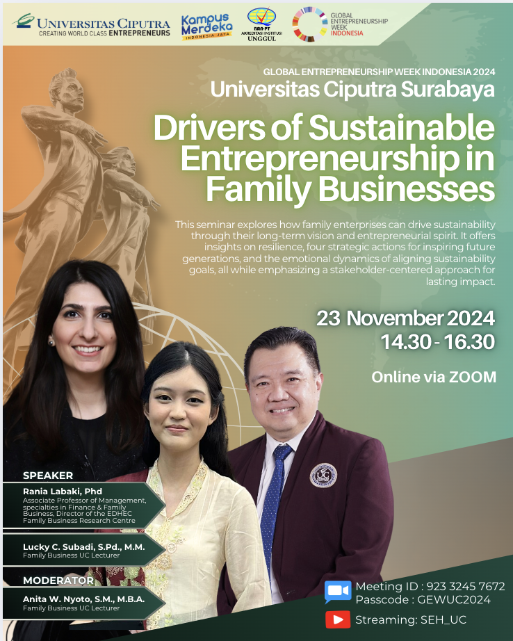 The event began at 2:30 PM with a brief opening by Mr. Lucky C. Subadi, S.Pd., M.M., a Family Business lecturer at Universitas Ciputra Surabaya. The event then proceeded with a presentation by Dr. Rania Labaki, Associate Professor of Management specializing in Finance and Family Business, and Director of the EDHEC Family Business Research Centre. The insights she shared today were drawn from her research and practical experience. According to her, every organization needs to know where it is headed and decide on the means to achieve its goals. To ensure the success of this process across generations, individuals must remain open-minded and ensure that emotional, financial, and social aspects are preserved to maintain family harmony. At the same time, they must not disappoint family members who aspire to join the family business.