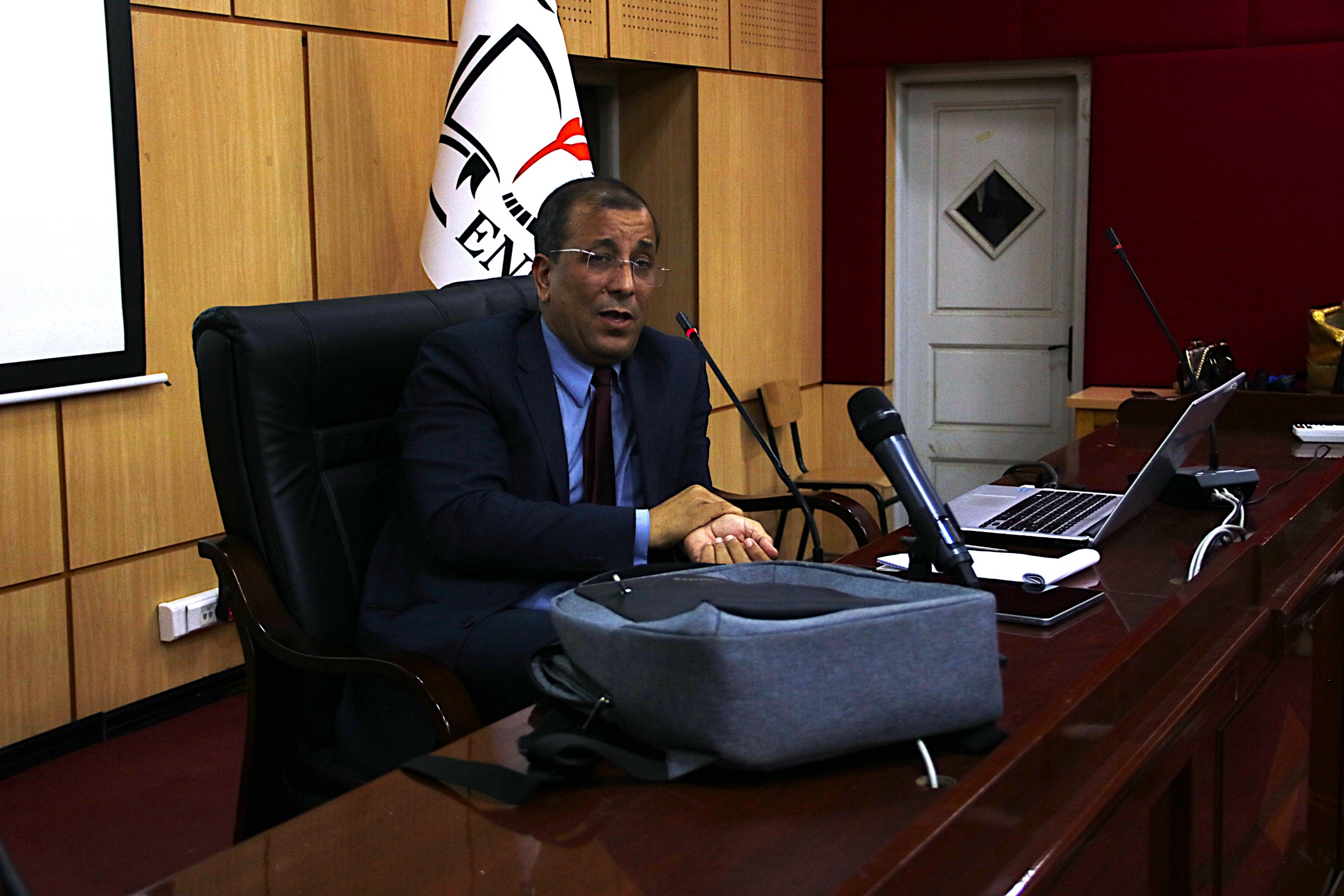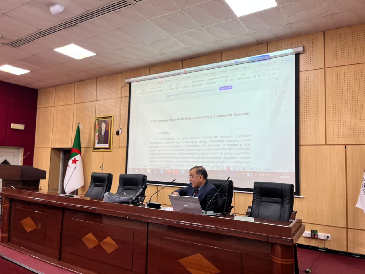 تلقا البروفيسور محمد هدير مداخلة افتتاحية بعنوان المقاولاتية كأداة لتفعيل الاقتصاد أين تحدث عن اهمية المقاولاتية في رفع اقتصاد البلاد و ذكر تجارب حية من الواقع لمقاولين نجحو في المجال