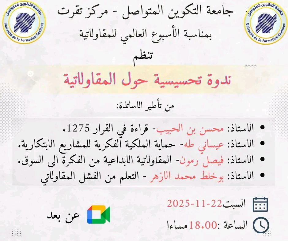 جانب من الندوة الخاصة بالمقاولاتية المنظمة امسية السبت 22 نوفمبر 2025 على الساعة 18:00