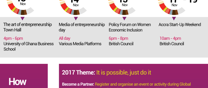 Ghana will join the world to mark the celebration of the 10th anniversary of GLobal Entrepreneurship Week, the world’s largest program to celebrate and promote entrepreneurship, from Nov 13 - 19, 2017. For one week each November, roughly 10 million participants take part in 35,000 events, activities and competitions in more than 165 countries around the world.