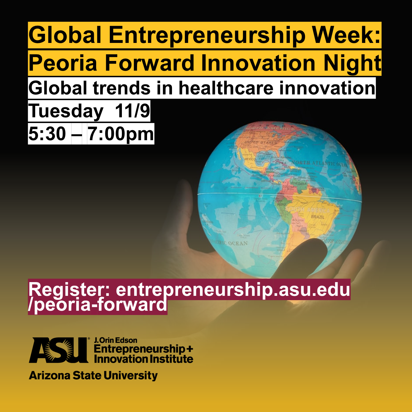 J. Orin Edson Entrepreneurship + Innovation Institute presents the third annual Innovation Night as part of the Global Entrepreneurs Week. Join innovators, leaders and entrepreneurs from across the West Valley. This year's topic is focused on global trends in healthcare innovation. Learn how the West Valley entrepreneurial ecosystem is rising to meet tomorrow's healthcare challenges through innovative education, high-growth ventures, and established partners creating new innovative pathways. You choose how you want to connect with an engaging online format or an in-person at the spacious Peoria Sports Complex Colonnade.