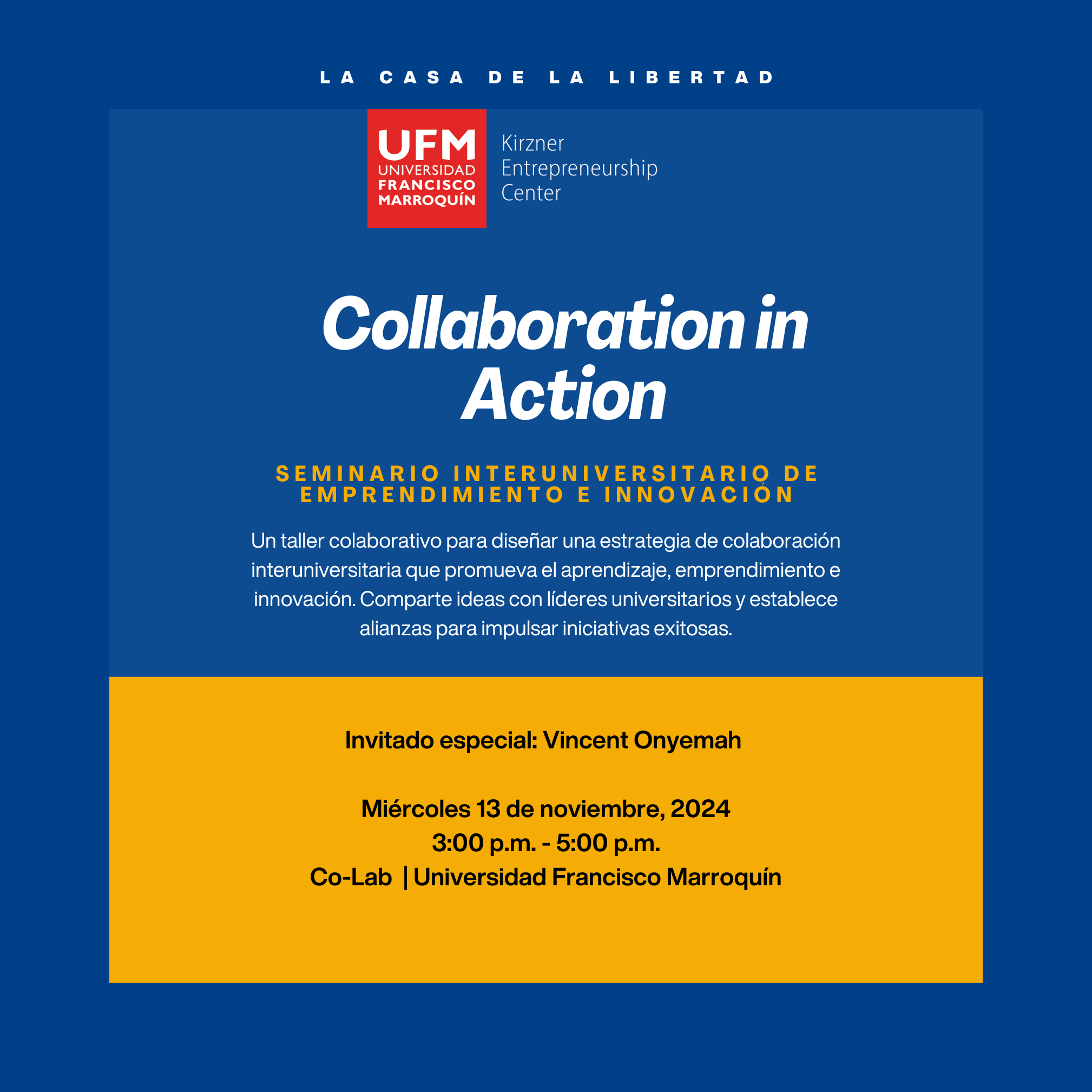 Collaborative workshop designed to develop a strategic approach for inter-university collaboration that promotes learning, entrepreneurship, and innovation. Join us to share insights with university leaders and build alliances to drive successful initiatives forward. This seminar provides a unique platform for fostering partnerships and creating a unified strategy that empowers student-driven entrepreneurship and innovation across institutions.