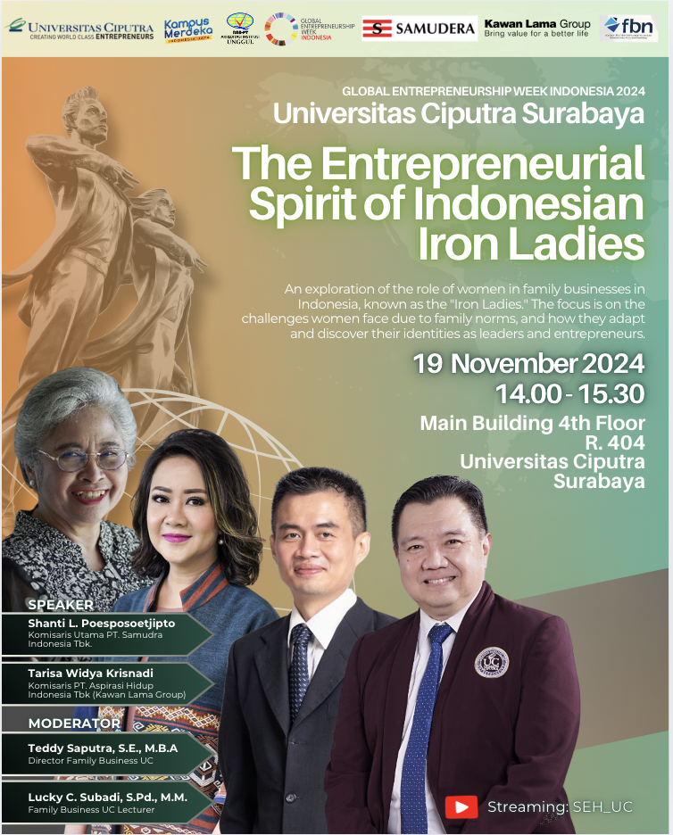 The event titled The Entrepreneurial Spirit of Indonesian Iron Ladies was held on Tuesday, November 19, 2024, from 2:00 PM to 3:30 PM at Main Building, 4th Floor, Room 404. The event began at 2:15 PM, with the MC introducing the speakers and explaining the expectations participants might have from the seminar. The MC introduced the two moderators who led the session. The seminar officially started at 2:37 PM, with the speakers, Mrs. Tarisa Widya Krisnadi and Mrs. Shanti L. Poesposoetjipto, sharing their backgrounds.