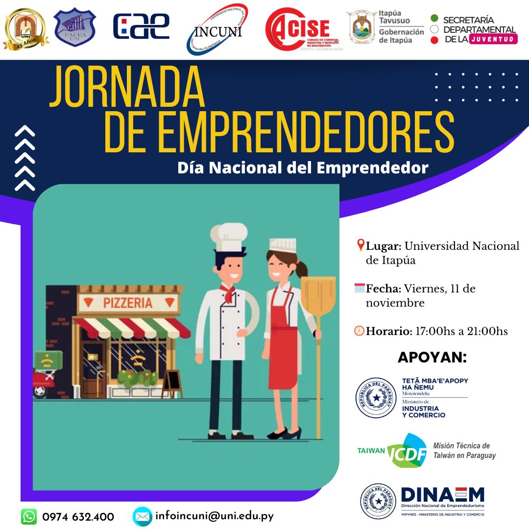 La Universidad Nacional de Itapúa a través del Centro de Apoyo a Emprendedores (CAE), la Incubadora de Empresas (INCUNI), la Facultad de Ciencias Económicas y Administrativas (FaCEA) y sus aliados, hace extensiva la invitación para participar de la jornada de emprendedores en donde éstos estarán presentando sus diversos productos.