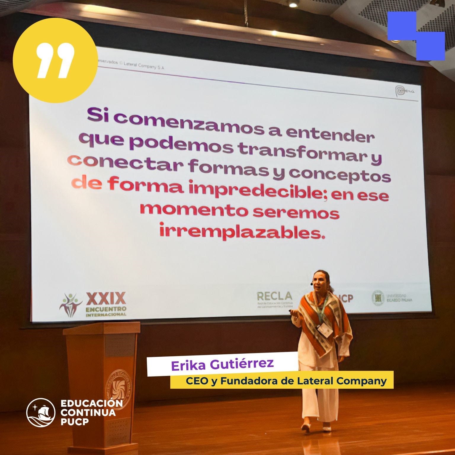 La CEO & Founder de Lateral, Erika Gutierrez Zaravia, fue invitada al XXIX Encuentro Internacional de la Red de Educación Continua de Latinoamérica y Europa 2024, coorganizado por la Pontificia Universidad Católica del Perú y la Universidad Ricardo Palma.