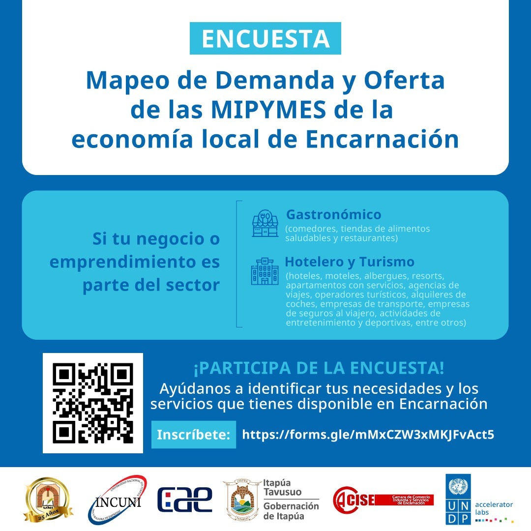 Si sos de la ciudad de Encarnación y tu negocio es parte del sector de Hotelería y Turismo o del sector Gastronómico, te invitamos a formar parte del proyecto de mapeo de Demanda y Oferta de las MIPYMES en la economía local de Encarnación.