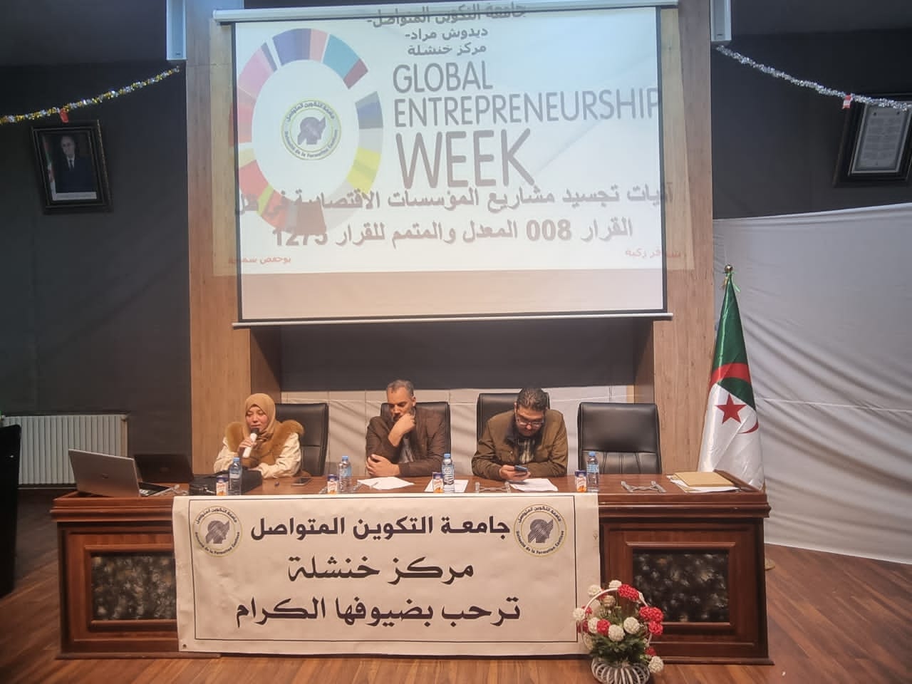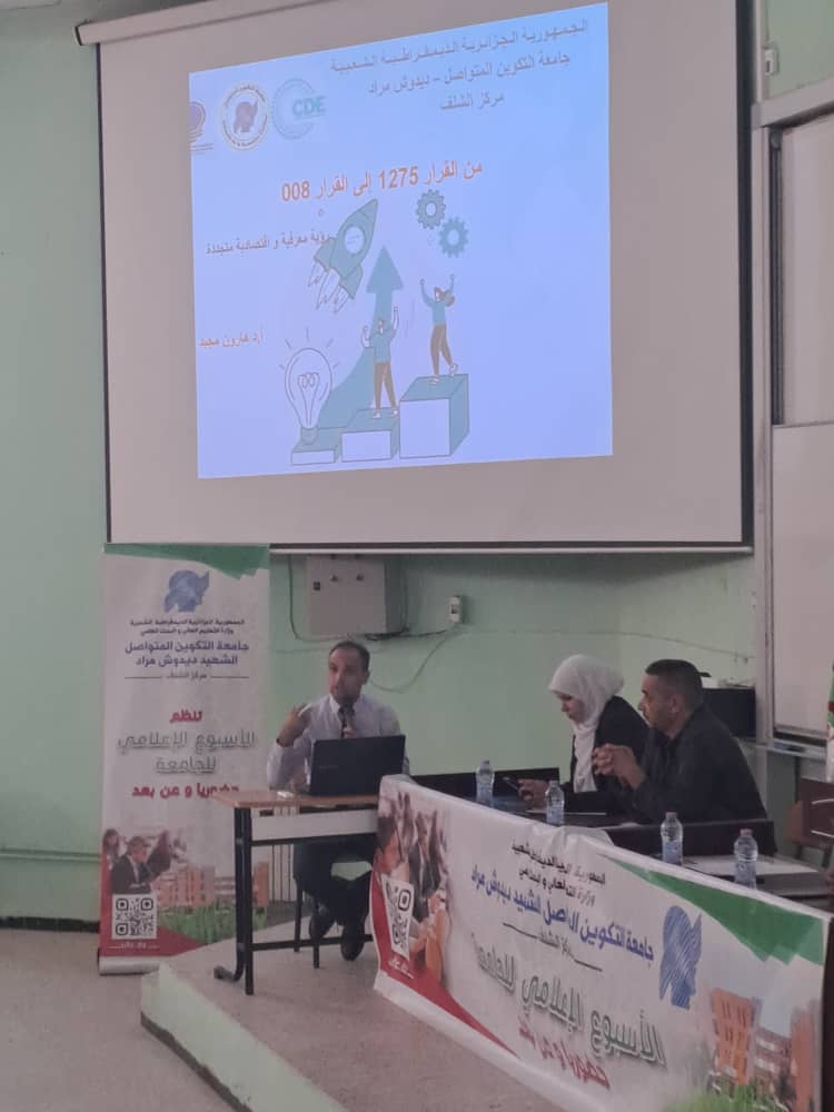 "خنشلة تم اليوم الاربعاء 19 نوفمبر 2025 ندوة علمية اولى بمناسبة الاسبوع العالمي للمقاولاتية ؛ تحت اشراف مدير المركز : ا.د . بوقطف محمود الندوة العلمية بعنوان : اليات انشاء وتنفيذ مشروع مؤسسة اقتصادية وفق القرار 008 المعدل والمتمم للقرار الوزاري 1275 . ا