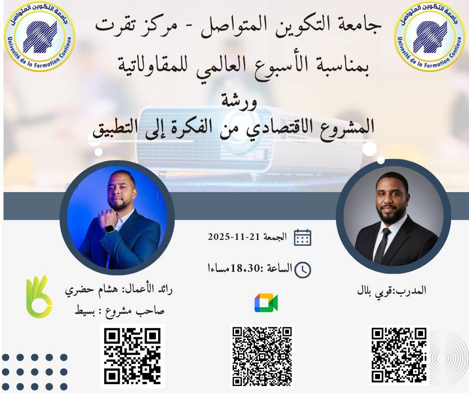 "تقرت دعوة خاصة لطلاب جامعة التكوين المتواصل - مركز تقرت بمناسبة الأسبوع العالمي للمقاولاتية (Global Entrepreneurship Week)! هل أنت طالب جامعي ولديك طموح بتحويل فكرتك إلى مشروع اقتصادي ناجح؟ ندعوكم للمشاركة في ورشة عمل نوعية وموجهة خصيصاً للطـلاب الط