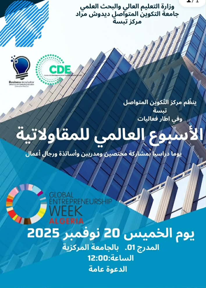 "إحياء الأسبوع العالمي للمقاولاتية هذا اليوم الخميس 20 نوفمبر 2025 إبتداء من الساعة 12 نظم مركز الطارف لجامعة التكوين المتواصل ديدوش مراد في إطار فعاليات الأسبوع العالمي للمقاولاتية لقاءات تحسيسية تحت شعار دقيقة للمقاولاتية لفائدة طلبة المركز أشرف
