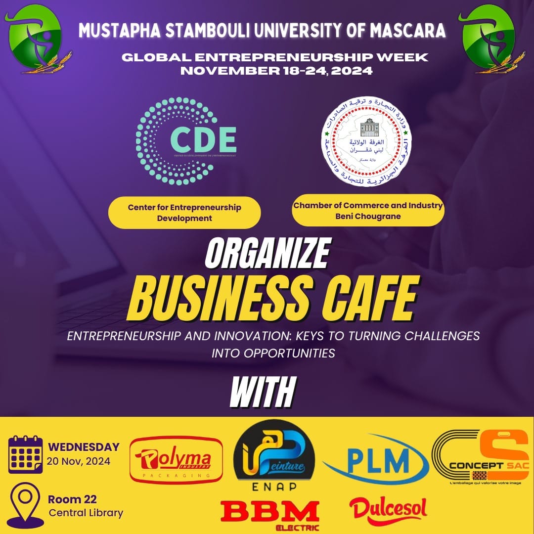 حضور و مشاركة اطارات المديرية في أشغال المقهى  بتاريخ 20 نوفمبر 2024 وضمن فعاليات الأسبوع العالمي للمقاولاتية الذي تم تنظيمه من طرف مركز تطوير المقاولاتية بالتنسيق مع غرفة_الصناعة والتجارة بني شقران لولاية معسكر