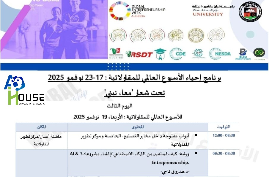 The Artificial Intelligence House at the University of Djelfa's Faculty of Science and Technology is a dedicated facility inaugurated at the start of the 2024/2025 academic year. This center focuses on advancing research and innovation in artificial intelligence (AI). It serves as a collaborative hub for students and researchers to work together, exchange ideas, and develop AI-related projects. The initiative aims to foster advancements in AI technologies and align with the latest scientific and technological developments, contributing to the university's role as a leader in cutting-edge research and education.